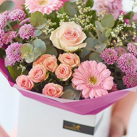 A bouquet of fresh, softly coloured pastel flowers expertly arranged by a local florist.
