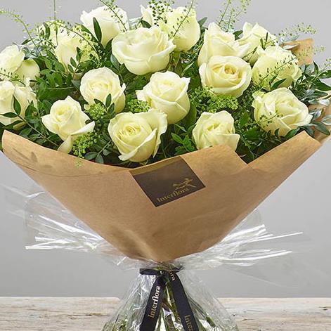 Featuring large headed white roses hand-tied with thlaspi, salal leaves and pistache, and presented in luxury paper with a bubble of water.